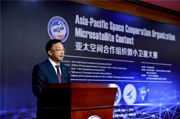 李新军在致辞中用“最令人信任的合作伙伴”赞扬了学校长期为亚太区域空间合作与交流做出的卓有成效的贡献。他表示,希望通过微小卫星大赛,为亚太区域及“一带一路”沿线国家师生提供学习和实践航空航天知识的机会,激励更多的专家学者学生共同参与到和平利用太空的工作中,并为之贡献智慧。